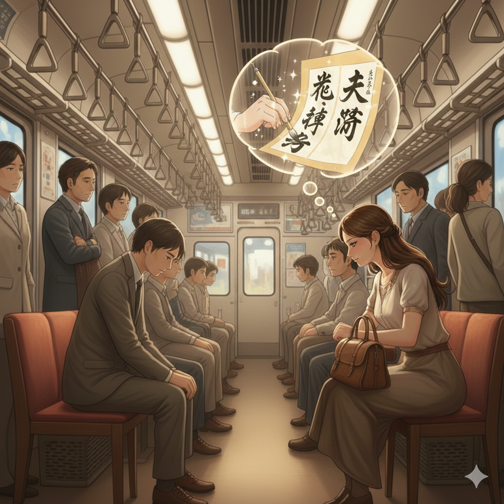 吊り広告に書かれたキャッチコピーを、頭の中で一文字ずつ「毛筆」で書き写します。